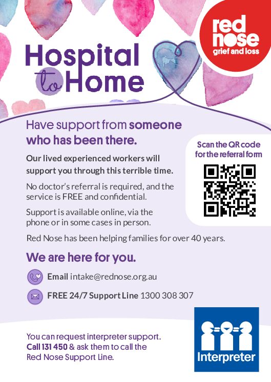 Red Nose offers FREE support and connections to other people who have been though the same or similar experience of having a pregnancy, baby or child loss. Red Nose supports anyone impacted by the loss of a pregnancy, stillbirth, death of a baby or child.